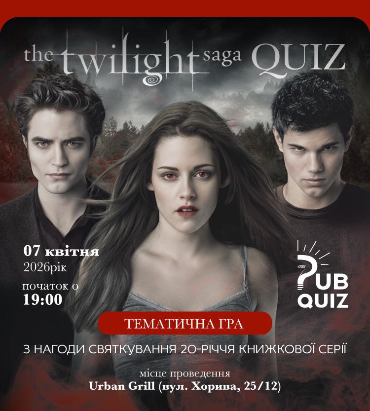 Повертаємось у світ вампірів, перевертнів і непростих рішень. На вас чекають запитання за мотивами історії, що свого часу підкорила мільйони: персонажі, сюжетні повороти, культові сцени та деталі, які пам’ятають лише справжні фанати.